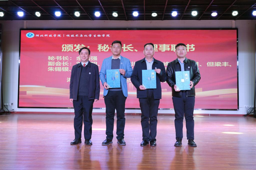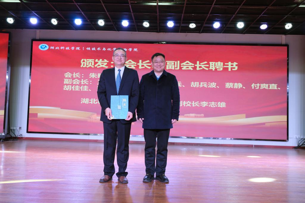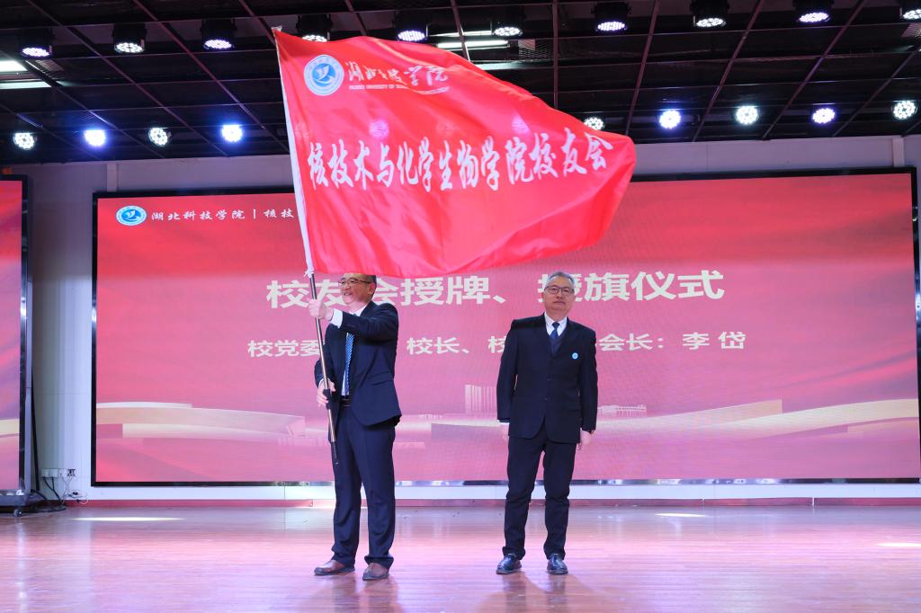 核技术与化学生物学院院长朱晓明向出席大会的领导嘉宾作了院情介绍,校友总会秘书长陈洪国宣读了学校校友总会关于成立核技术与化学生物学院校友分会的批复文件。李岱校长为第一届校友会会长朱晓明授牌、授旗。李志雄副校长向校友会理事会成员颁发聘书。